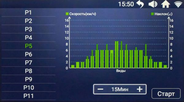 | Показания консоли: | программный профиль, время, дистанция, скорость, угол наклона, калории, пульс |