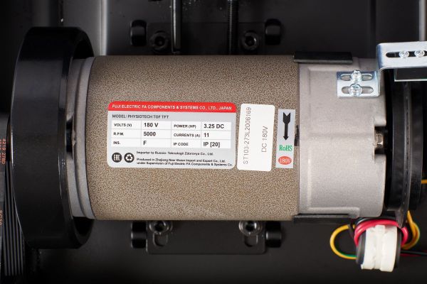 Надежный, двигатель японской Fuji Electric мощностью 3,25 л.с. постоянного тока разгоняет дорожку до 16 км/ч. Размер бегового полотна 138х46 см. Электрически изменяемый угол наклона от 0 до 15% . За качество скольжения отвечает многослойное полотно NНT-218 толщиной 1,8 мм. швейцарского бренда Habasit и парафинированная дека толщиной 18 мм. В дорожку установлена одна и самых передовых амортизационных платформ – здесь работает связка из 4-ех полиуретан-гелиевых амортизаторов air-CUSHION™ и 4-ех полноразмерных динамических эластомеров VCS™ профессионального уровня.