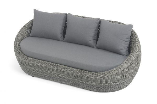 Трехместный диван дополняют мягкие подушки в сером цвете со съёмными чехлами. Тканевые изделия выполнены из прочного полиэстера плотностью 300гр/м2. Материал имеет влагоотталкивающую пропитку.