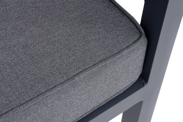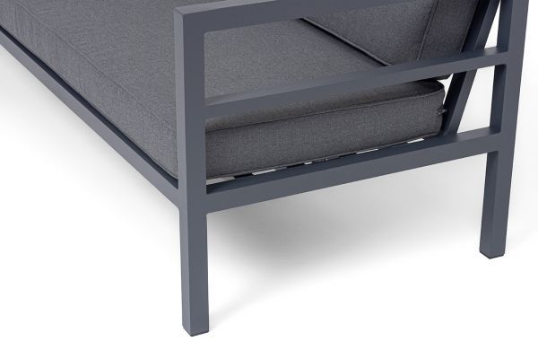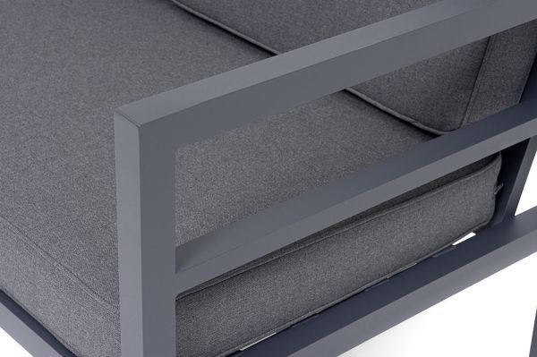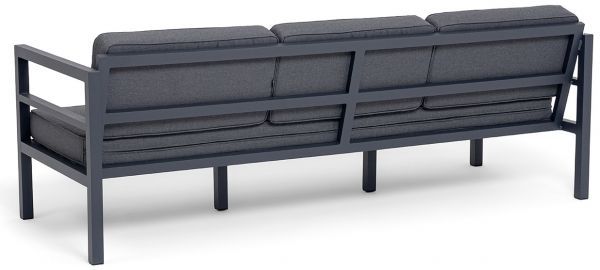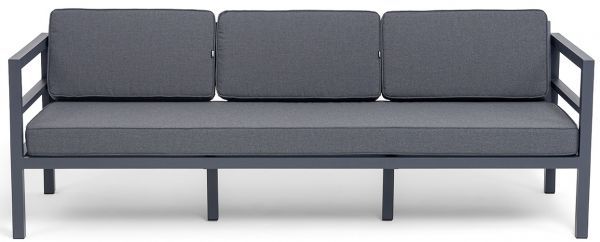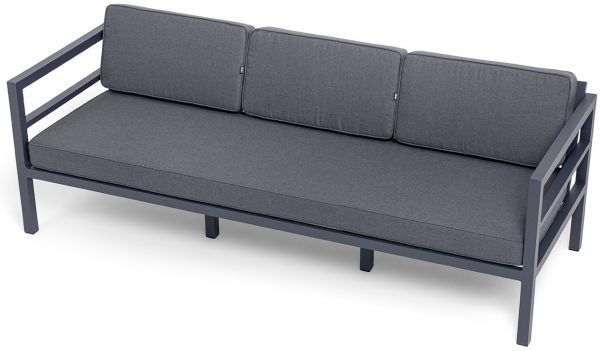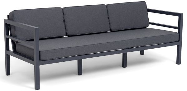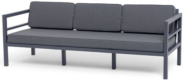 Трехместный диван «Эстелья». Каркас из алюминия, окрашенный в темно-серый (RAL7024) цвет, мягкие подушки на сидениях и спинках со съёмными чехлами цвета серый гранит.