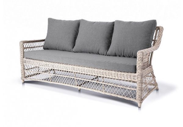 Модель выполнена с помощью ручного круглого плетения из искусственного ротанга. Трехместный диван представлен в бежевом цвете.