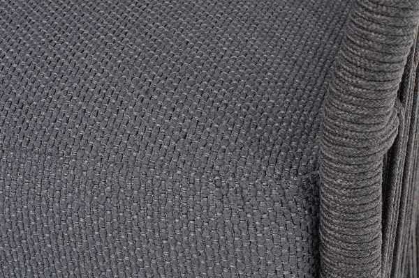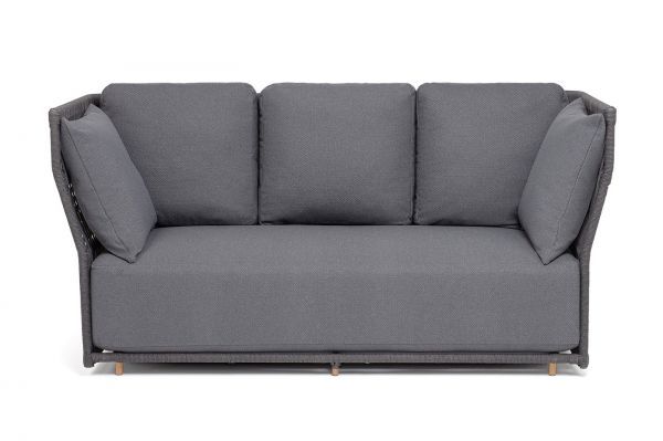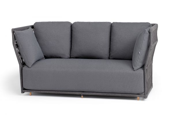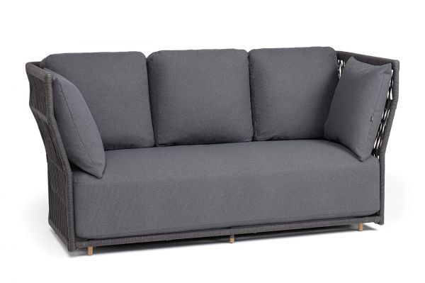Диван имеет алюминиевый каркас, окрашенный порошковой краской в темно-серый цвет. Боковины каркаса и спинка вручную оплетены роупом - эластичными синтетическими лентами, изготовленными из высокопрочных полиэфирных волокон. Цвет оплетки в тон каркасу - темно-серый.