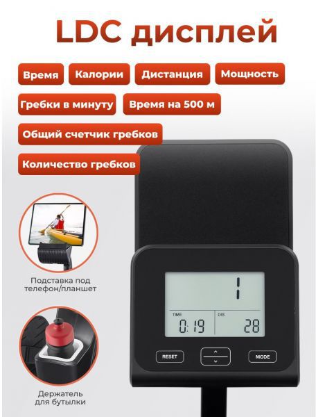 Тренажёр оснащён монохромным LCD-дисплеем, отображающим ключевые показатели тренировки — время, дистанция, ватт, калории, гребки в минуту, время на 500 м, количество гребков, общий счетчик гребков. Это помогает отслеживать прогресс и контролировать результативность занятий. В комплект входят две батарейки типа AAA, необходимые для работы дисплея. Этот гребной тренажер оснащен функцией Bluetooth, вы можете подключиться к FitShow и Kinomap через Bluetooth.
