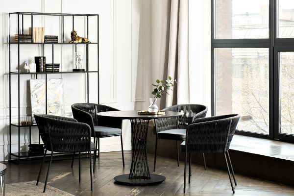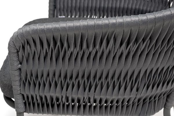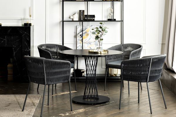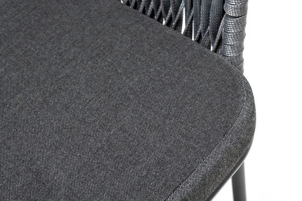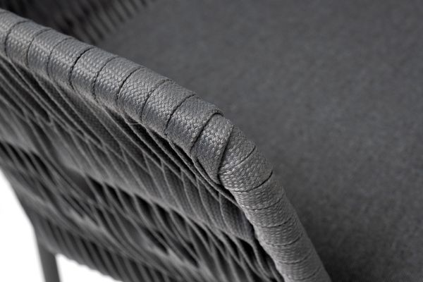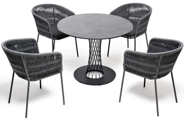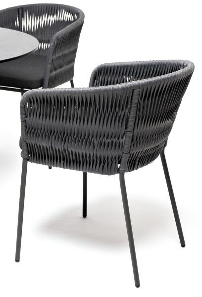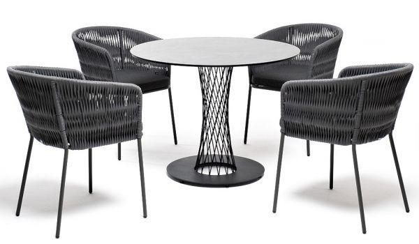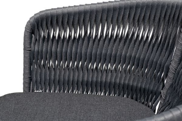 Вместе с этим, в комплектацию входит 4 плетеных стула «Бордо», выполненных с использованием высокопрочного роуп-волокна серого цвета с плетением вида «колос». Стулья имеют размеры 570×620×775 мм и устойчивый каркас из алюминия, окрашенной порошковой краской темно-серого цвета.