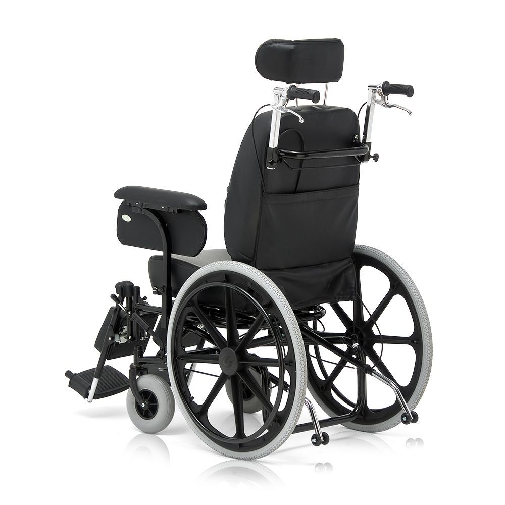 На съемных подножках и подлокотниках можно отрегулировать высоту. Опоры для ног и рук оснащены мягкими подушечками. Этот элемент добавляет комфорта при движении и стоянке. Высокая спинка кресла может опускаться под углом до 30°.