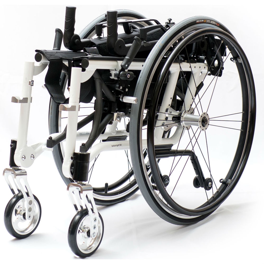 Коляска оснащена тормозами, которые настраиваются по глубине и углу, антиопрокидывателями, настраиваемыми по высоте, и стояночным тормозом.