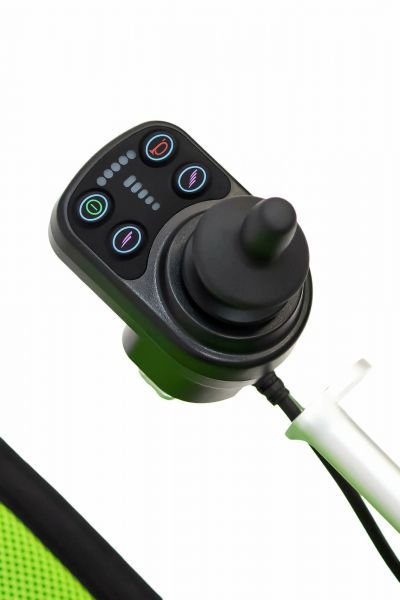 Контроллер находится рядом с подлокотниками, и его можно установить, при необходимости, с любой удобной для пользователя стороны. На нем размещены джойстик для управления коляской, кнопка звукового сигнала, кнопка включения/выключения, а также кнопки регулировки скорости. В комплекте идет съёмный фонарик со встроенным USB-разъёмом, который можно использовать для зарядки телефона.
