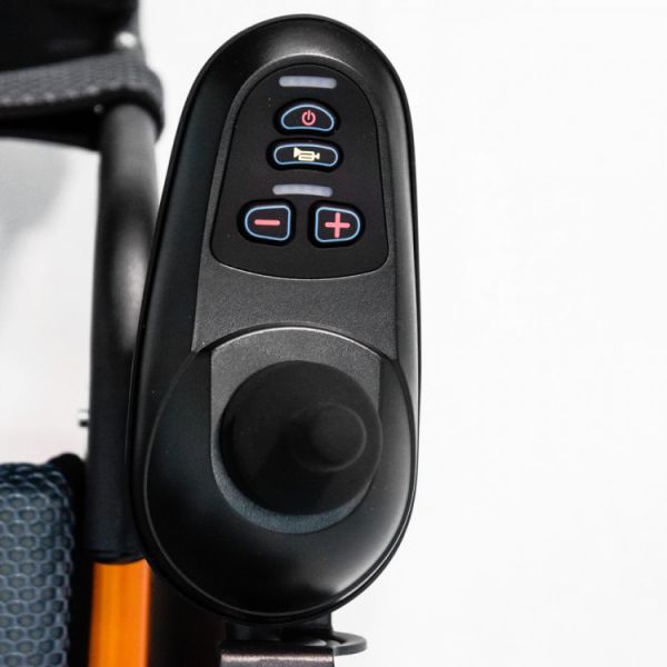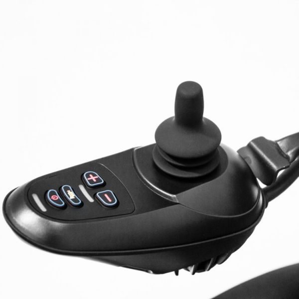 Контроллер может быть расположен рядом с подлокотником как с правой, так и с левой стороны, что делает управление удобным не только для правшей, но и для левшей. На нем расположен джойстик для управления коляской, кнопка звукового сигнала и кнопки регулировки скорости. В комплекте идет съёмный фонарик со встроенным USB-разъёмом, который можно использовать для зарядки телефона.