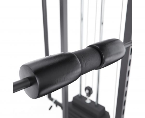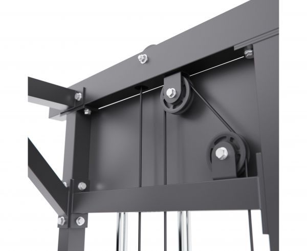 Тренажёр оснащён верхними и нижними блоками, а также набором рукоятей: прямая, V-образная, манжета для ног и дополнительные адаптеры. Система тросов использует тросы длиной 60 см и диаметром 5 мм, оснащённые пружинами и фиксаторами, что обеспечивает плавный ход, точную регулировку нагрузки и долговечность в условиях интенсивной эксплуатации. На стойках расположены держатели для весовых пластин, а встроенный гриф имеет длину 80 см и толщину 5 мм, что обеспечивает удобную загрузку дисков и стабильную работу при выполнении упражнений.
