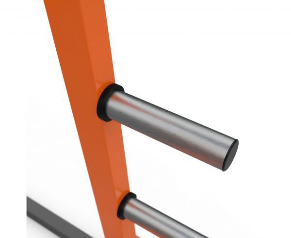 Диаметр дисков для хранения 51 мм, нагрузка на каждый из держателей дисков до 60 кг. Размер основной рамы 70 х 50 х 2 мм, размер соединительных перекладин 50 х 50 х 2 мм. Высота грифа регулируется по высоте в 10-ти положениях.