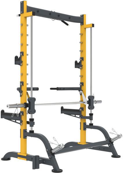 Машина Смита представляет собой силовой тренажёр с прочной стальной рамой, выполненной в жёлто-чёрной цветовой гамме. Конструкция имеет устойчивую П-образную форму и оснащена двумя основными вертикальными направляющими, по которым перемещается фиксированный гриф. По всей высоте стоек расположено множество уровней фиксации, позволяющих точно настраивать рабочую высоту штанги под различные упражнения и рост пользователя.