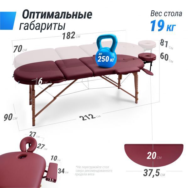 Деревянная кушетка для массажа выделяется невероятно прочной конструкцией, способной выдержать общую нагрузку до 250 кг (не перегружайте стол сверх рекомендованного предела веса). Благодаря своим компактным размерам 182 х 69 см, она идеально впишется даже в самые небольшие помещения, будь то СПА-салон, домашний кабинет или офис. Возможность ручной регулировки высоты ножек от 60 до 81 см с шагом 3 см позволяет адаптировать стол под рост массажиста, обеспечивая наилучшую результативность сеансов массажа. Ложе толщиной 7 см обеспечит дополнительную поддержку и комфорт. Обивка стола выполнена из высококачественной эко-кожи, устойчивой к воздействию влаги, масел и кремов, что облегчает уход за ним и продлевает срок службы.
