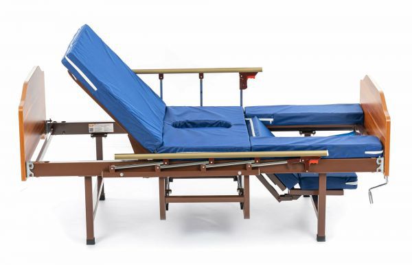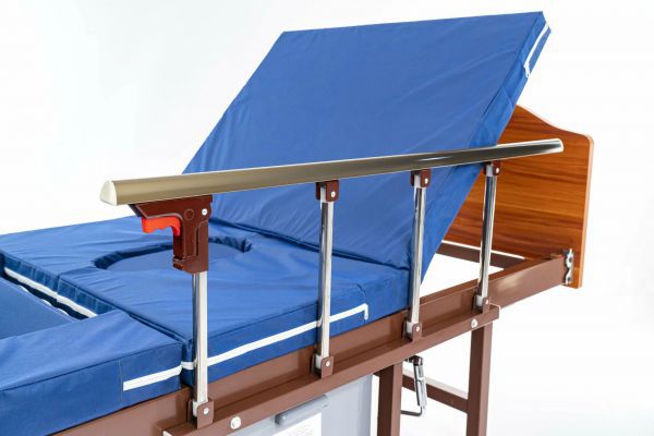 Недорогая четырехсекционная функциональная кровать-кресло с независимыми винтовыми регулировками угла наклона спинной секции и положения секций. Боковые ограждения в комплекте.