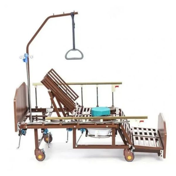 Медицинская кровать с функцией переворачивания, спинками из ЛДСП приятной "деревянной" текстуры, объединяющая в себе функции кардио-кресла и переворачивания больного с санитарным оснащением.