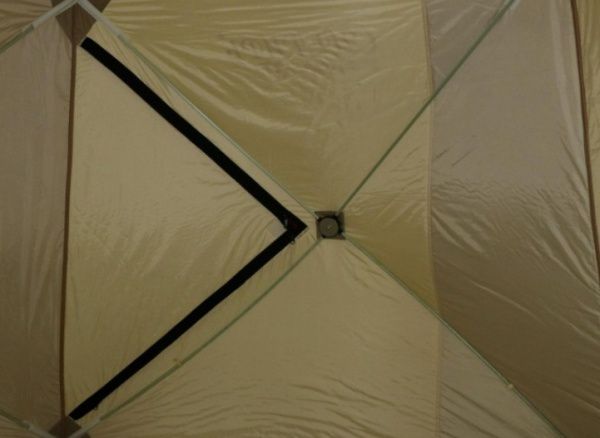 Стены палатки изготовлены из двух слоев водоотталкивающей ткани Oxford 240D с полиуретановым покрытием, между которыми находится толстый слой утеплителя, синтепона плотностью 150г/м2. Светлые ткани, используемые на внутренней части стен, обеспечивают отличную видимость внутри палатки, даже без открытия шторок на окнах. Каркас изготовлен из надежных пластиковых хабов и стеклокомпозитных материалов собственного производства, обладающих повышенной прочностью и жесткостью, благодаря чему палатке не страшен самый сильный ветер.