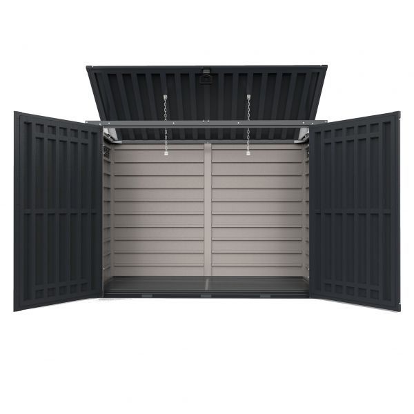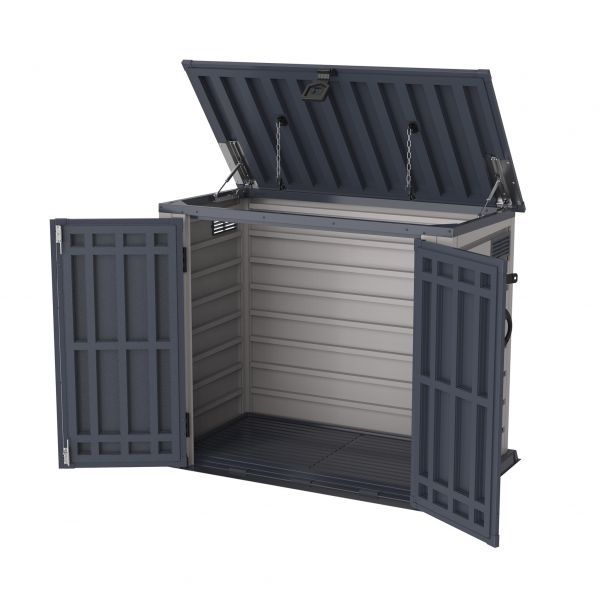 Вместимость и размеры - для хранения на открытом воздухе имеет вместимость 800 л и большие размеры, что дополняется широко открывающимися дверями и крышкой для дополнительного доступа.