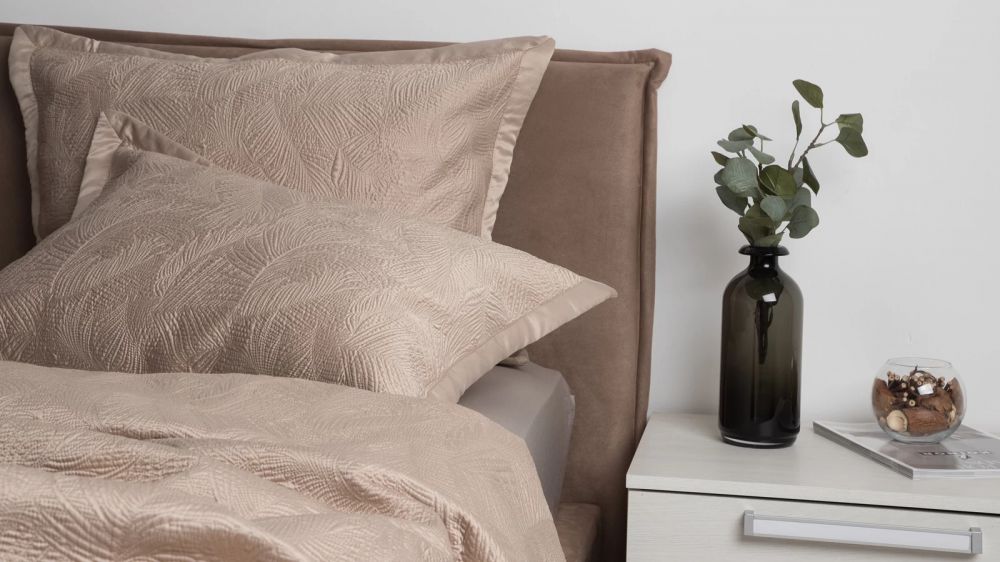 Комплект Beige – готовое декоративное решение для спальни. Однотонные покрывало и наволочки с фигурной стежкой добавят интерьеру благородства и уюта. Ткань с глянцевым, как у атласа, отблеском выглядит изысканно. Теплый бежевый цвет подчеркнет естественность обстановки, создаст ощущение свободы и безмятежности.