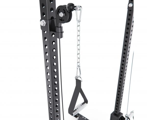 Встроенный кроссовер расширяет функциональность тренажера, позволяя прорабатывать все основные группы мышц. Кроме того, с одной стороны рамы предусмотрено специальное отверстие для установки грифа, которое позволяет использовать раму как Лэндмайн, выполняя жим и другие упражнения с естественной амплитудой движения.