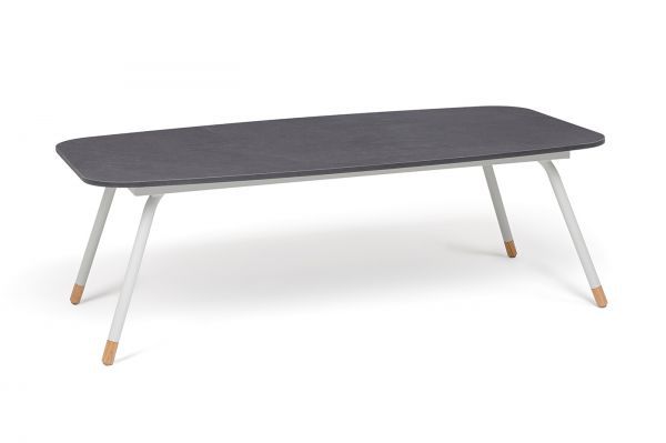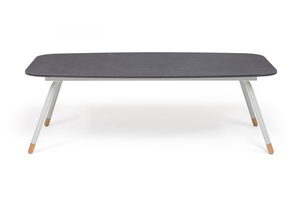 Каркас столика изготовлен из алюминия, окрашенного в светло-серый цвет. Алюминий является легким и прочным материалом, что обеспечивает долговечность и надежность изделия. На ножках столика идут дубовые наконечники (заглушки).