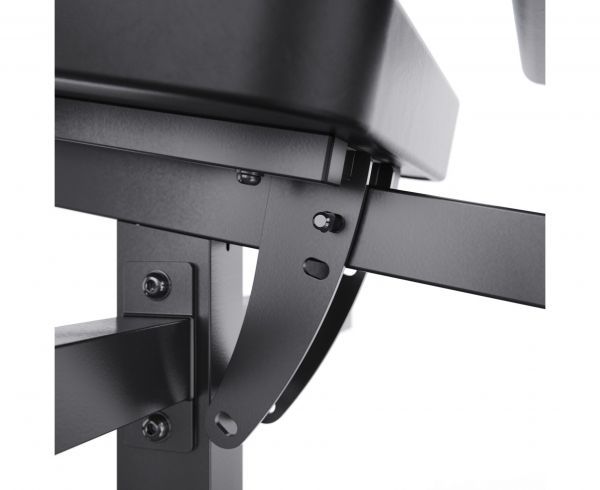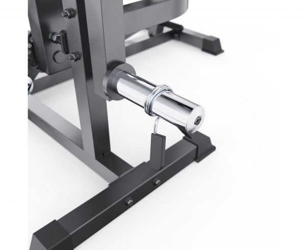 Вес тренажера — 47 кг, а максимальная допустимая нагрузка — 150 кг. Рама тренажера выполнена из стальной трубы с профилями 70 х 50 х 1,5 мм и 50 х 50 х 1,8 мм. Тренажер оснащен водонепроницаемой обивкой и толстыми валиками для комфортной и долговечной эксплуатации. Диаметр посадочного места под диски — 51 мм (грузы в комплект не входят). В комплект входит пружинный замок для фиксации веса.