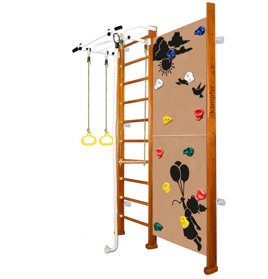 Детский спортивный комплекс Kampfer Jungle Wall - это классическая версия шведской стенки, одной из самых популярных моделей из линейки деревянных ДСК Kampfer, дополненная скалолазом с новым интересным дизайном для девочек. Модель Kampfer Jungle включает в себя набор из самых популярных навесных аксессуаров - канат, кольца, трапецию и скалолаз.